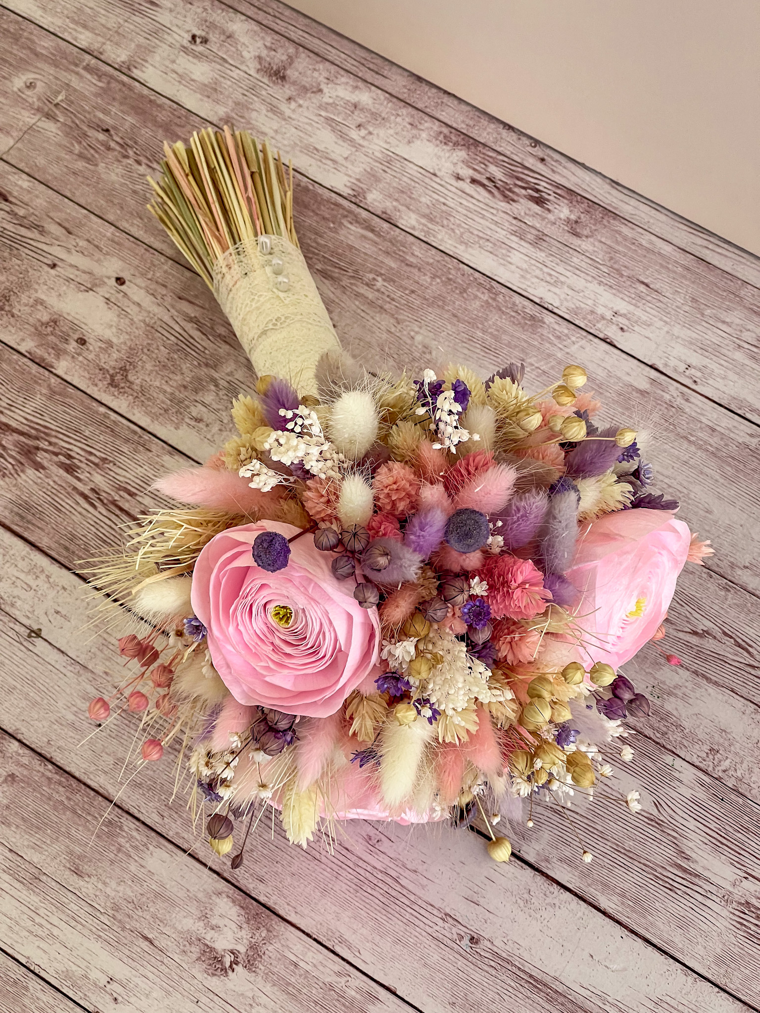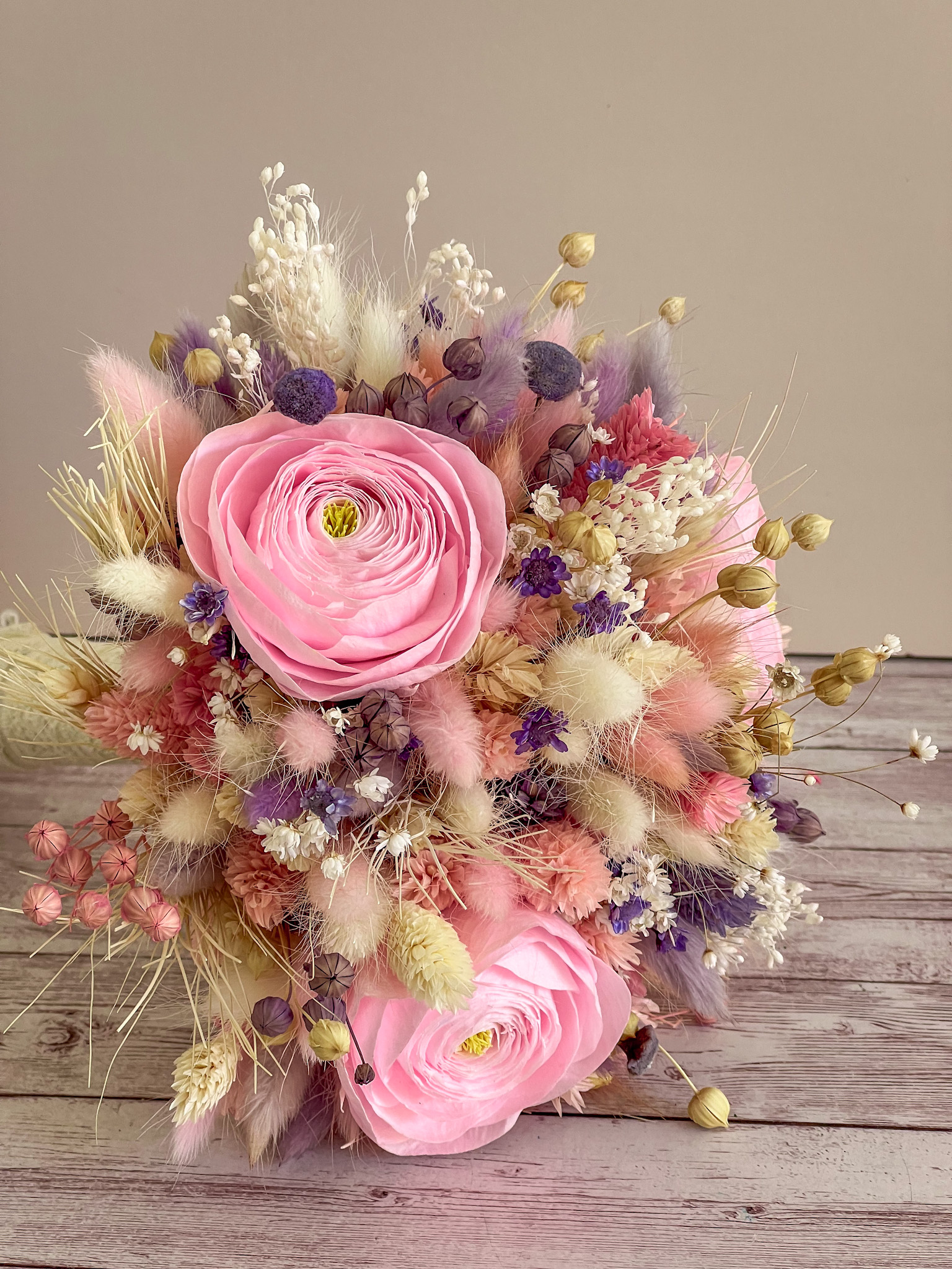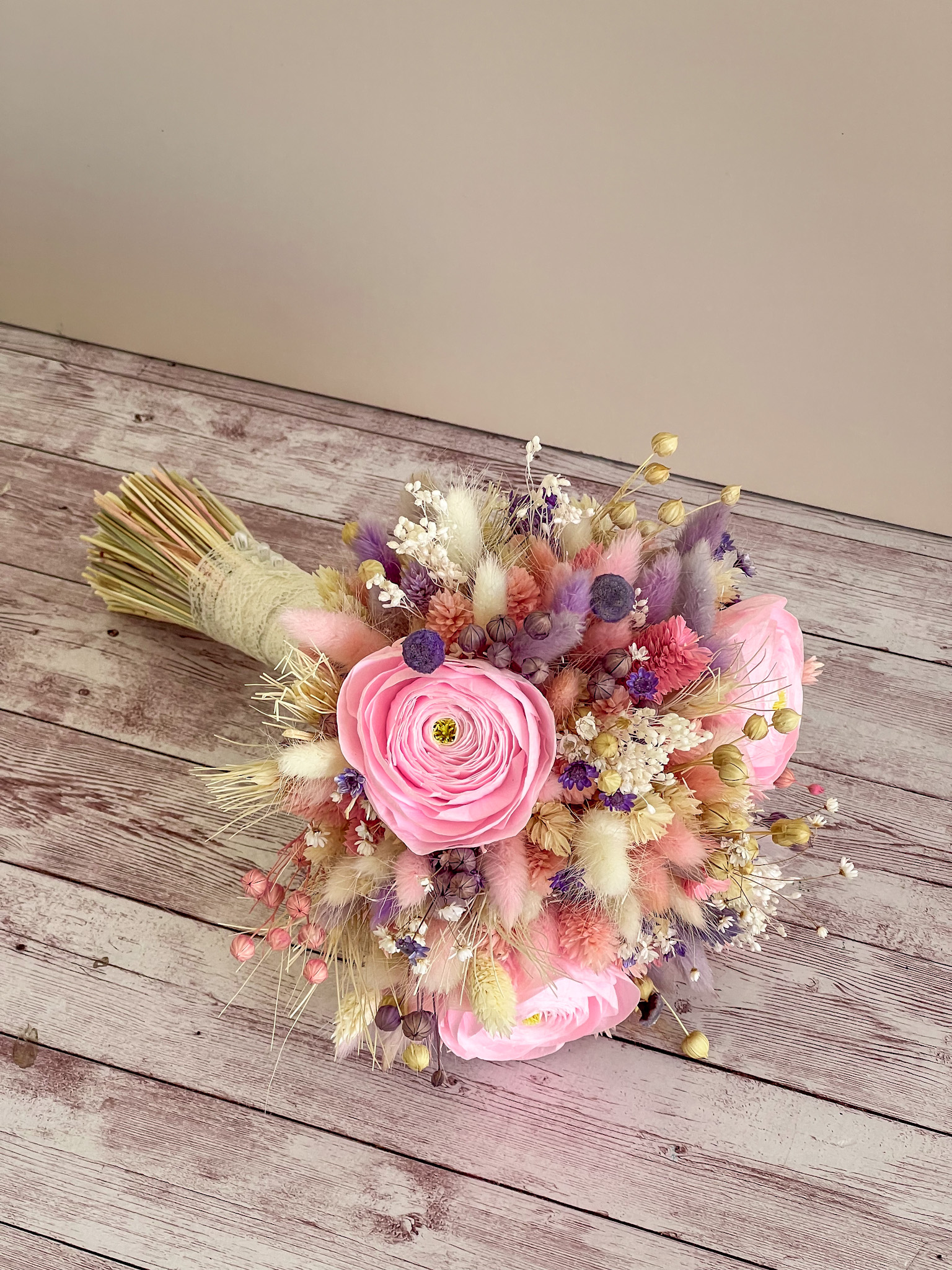 Ideal pentru nunta, cununie civila, sedinte foto. Este un buchet care spune povestea iubirii prin naturalete si eleganta durabila.