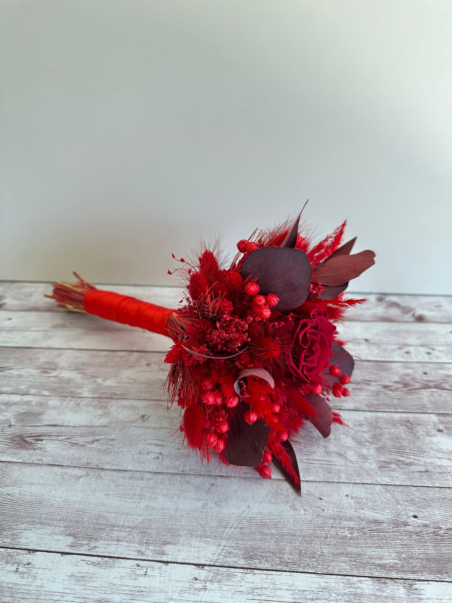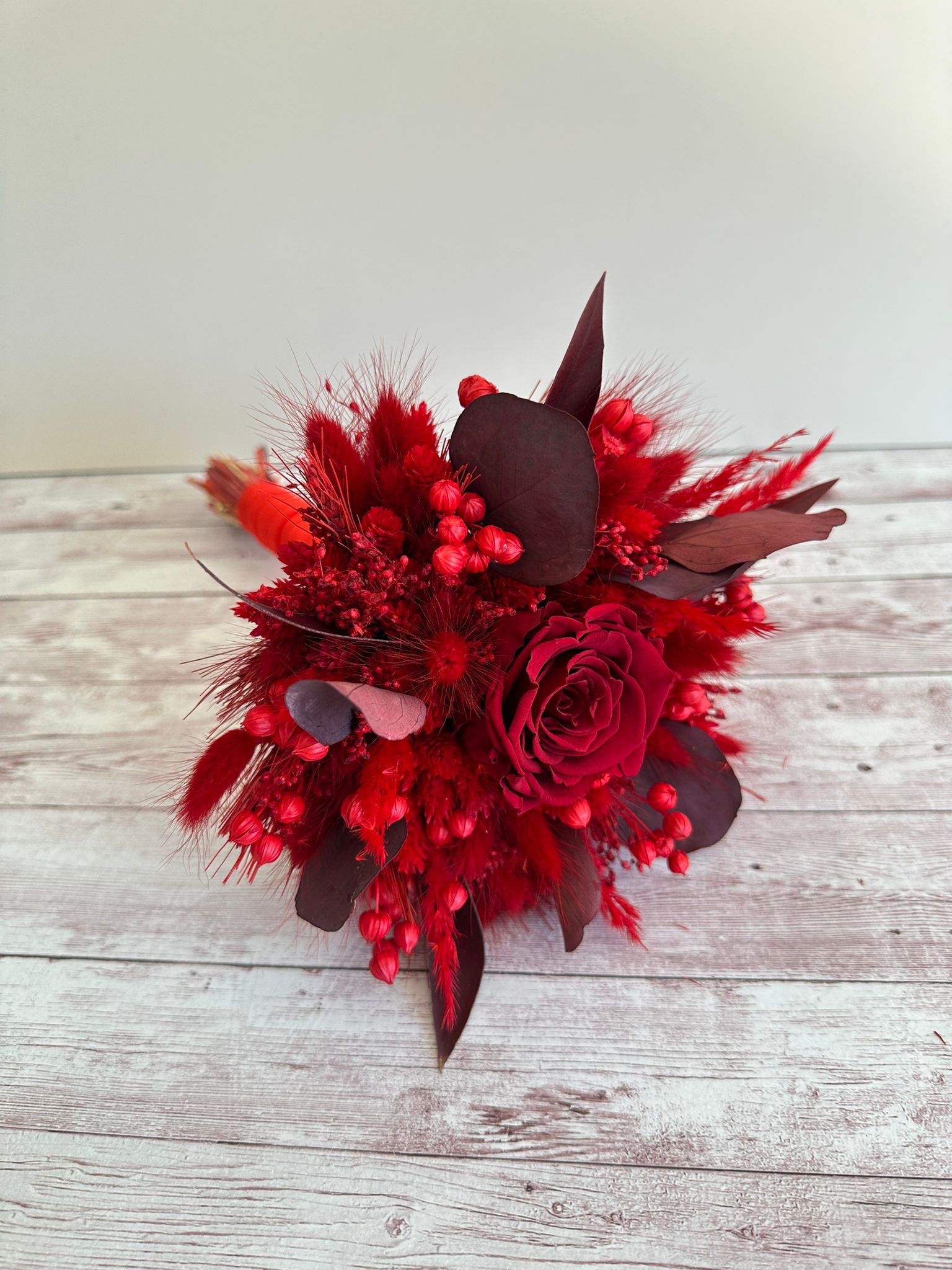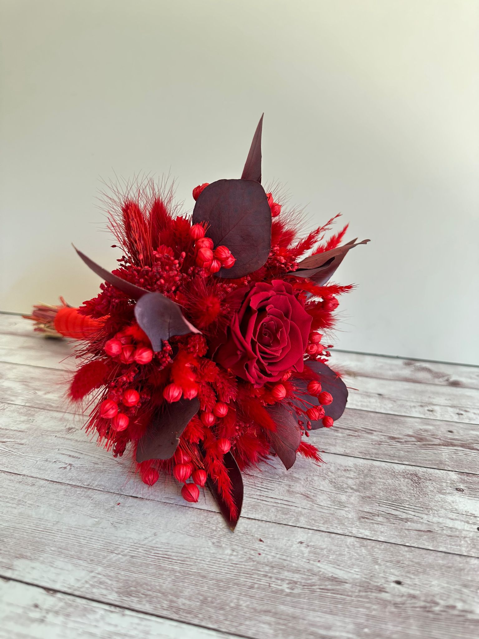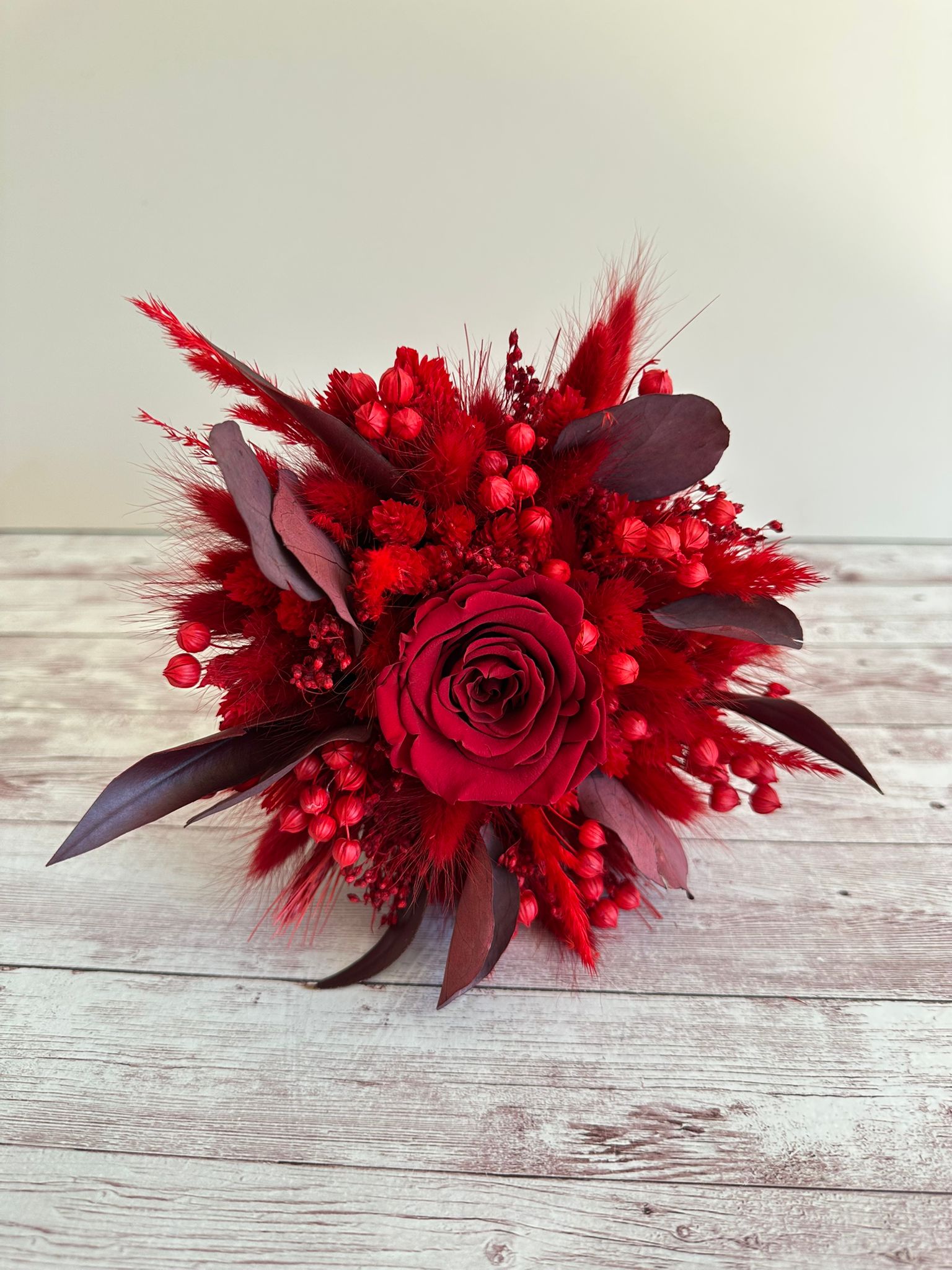 Buchet realizat manual dintr-un trandafir nemuritor roșu, completat de plante uscate și stabilizate în nuanțe intense de roșu și bordo. Culorile puternice îl transformă într-o piesă deosebită, ideală pentru nuntă, logodnă, ședințe foto sau ca decor elegant și de lungă durată.📏 Dimensiune: aprox. 17/19 cm diametru