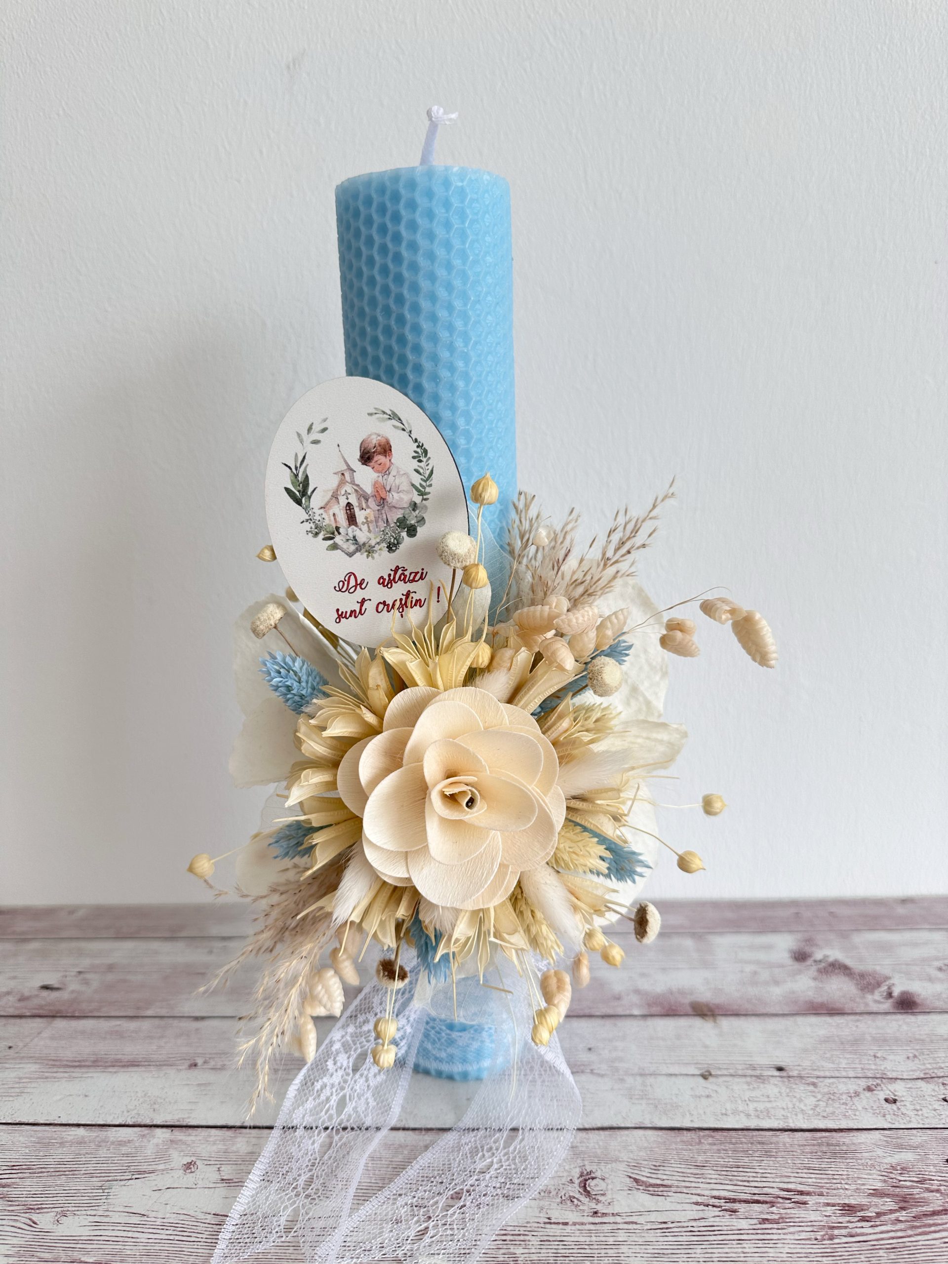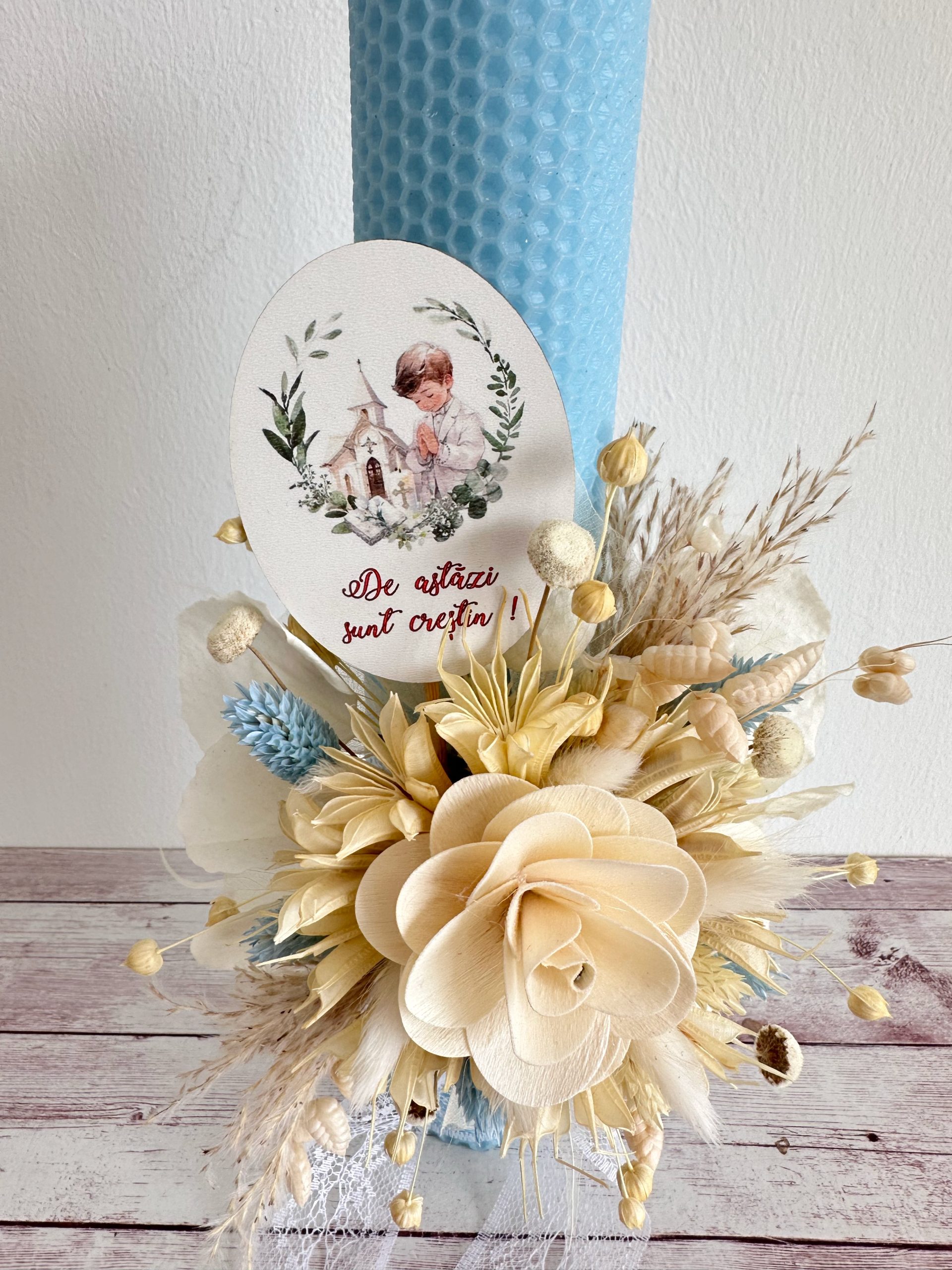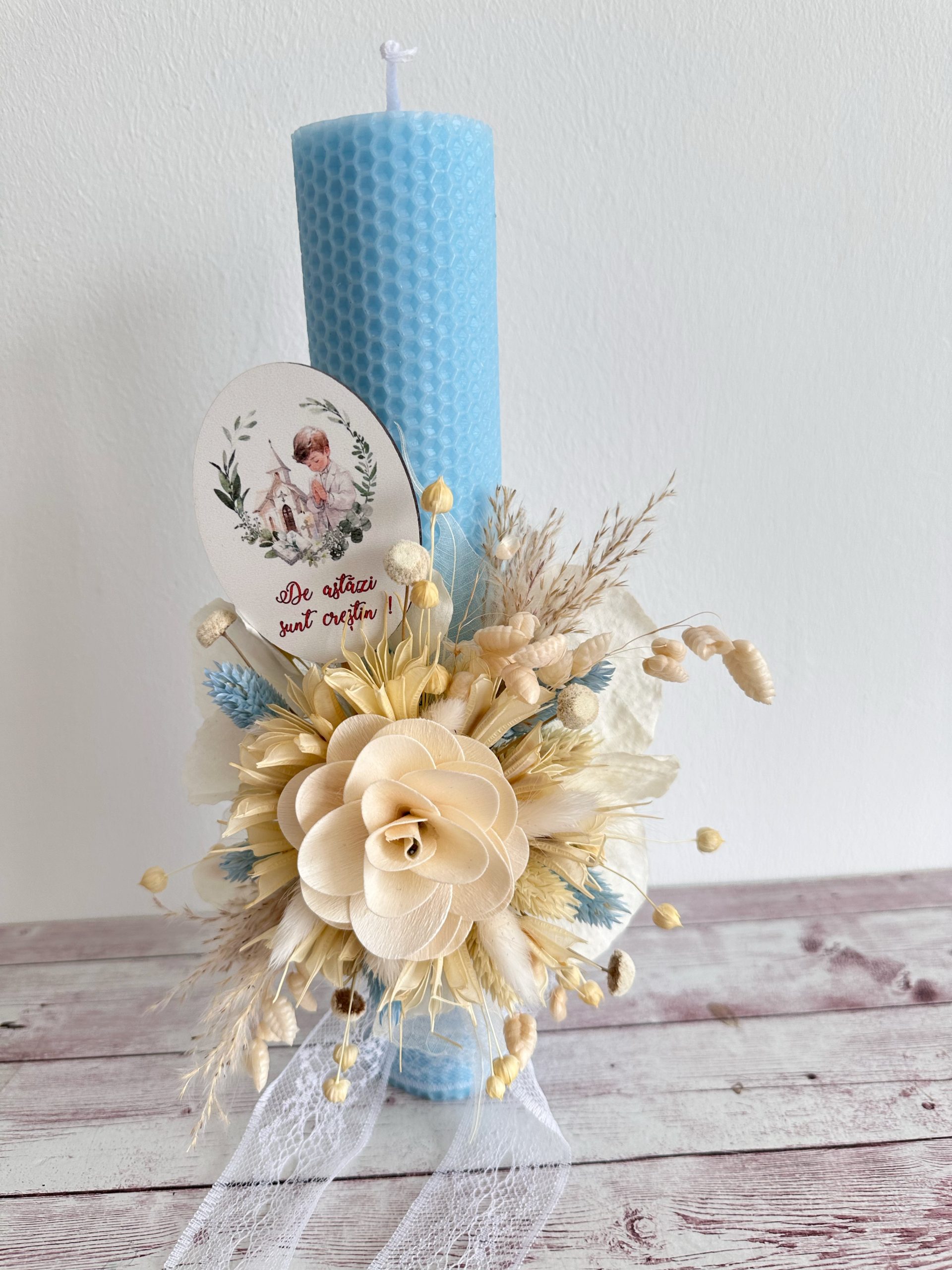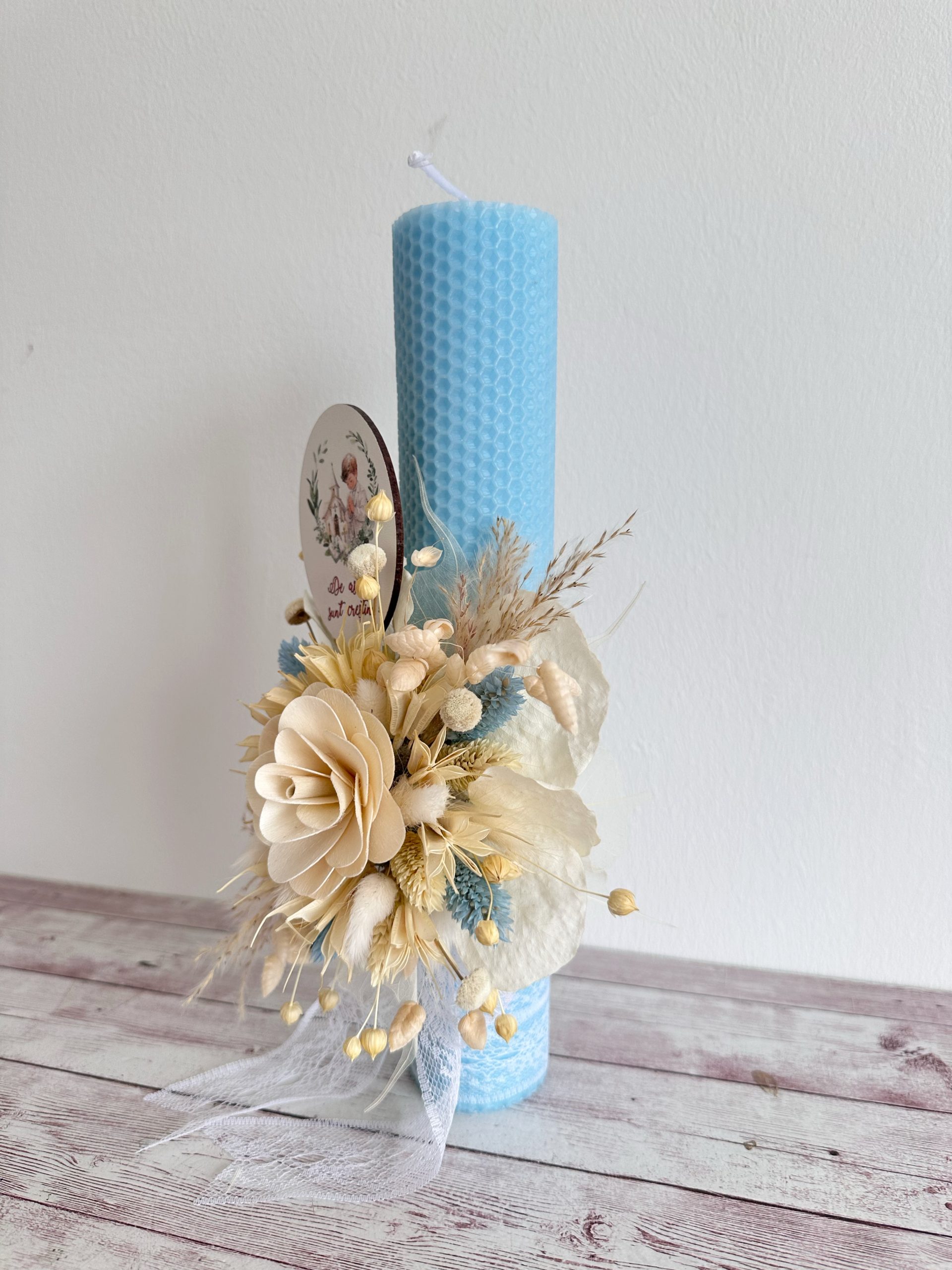 Aranjamentul floral handmade include o combinație armonioasă de texturi și nuanțe delicate de crem, alb și accente albastre, oferind un aspect natural și echilibrat. Floarea decorativă centrală și detaliile fine transformă această lumânare botez personalizată într-un accesoriu special, potrivit pentru tematici boho, rustice sau elegante.