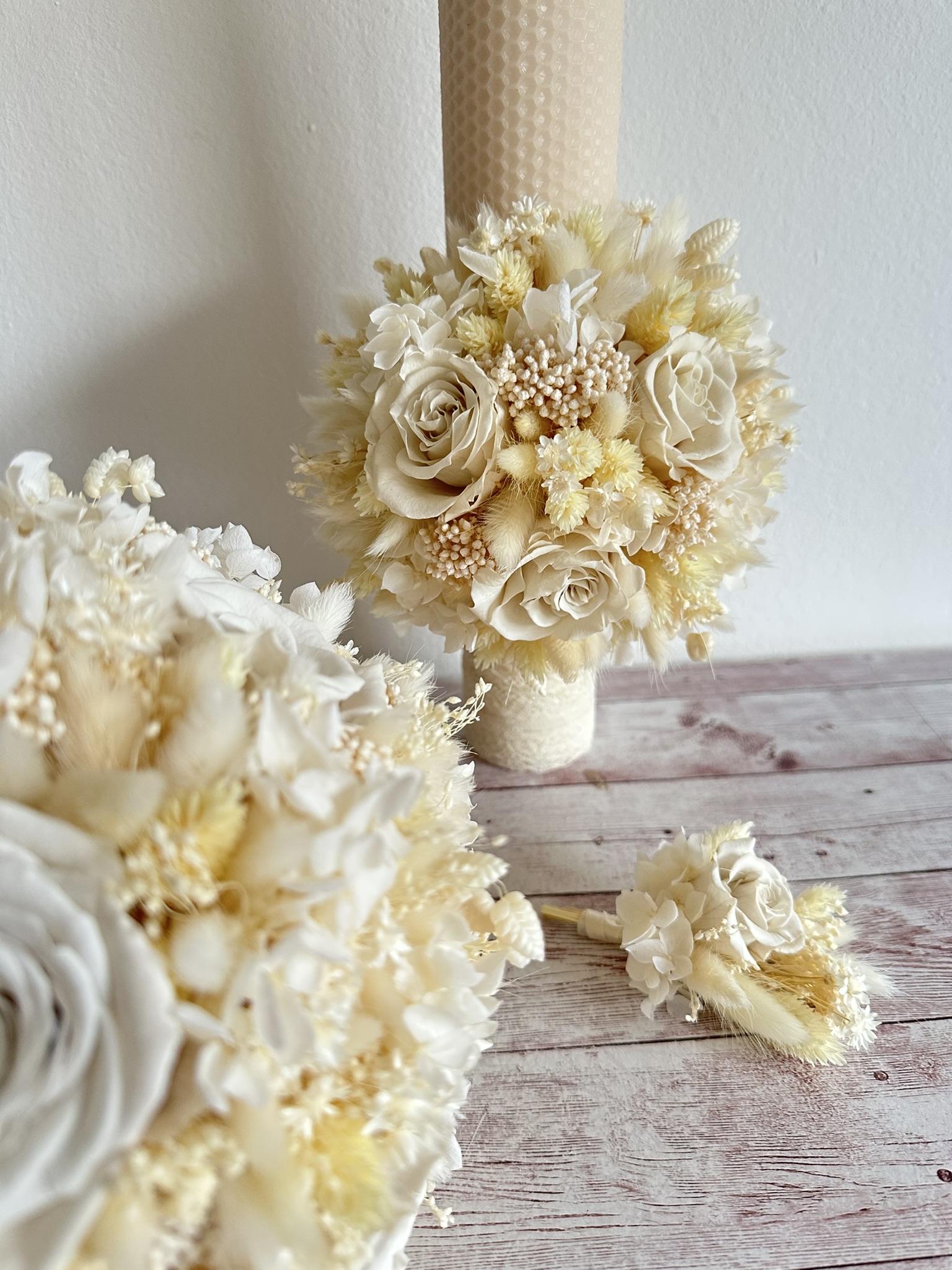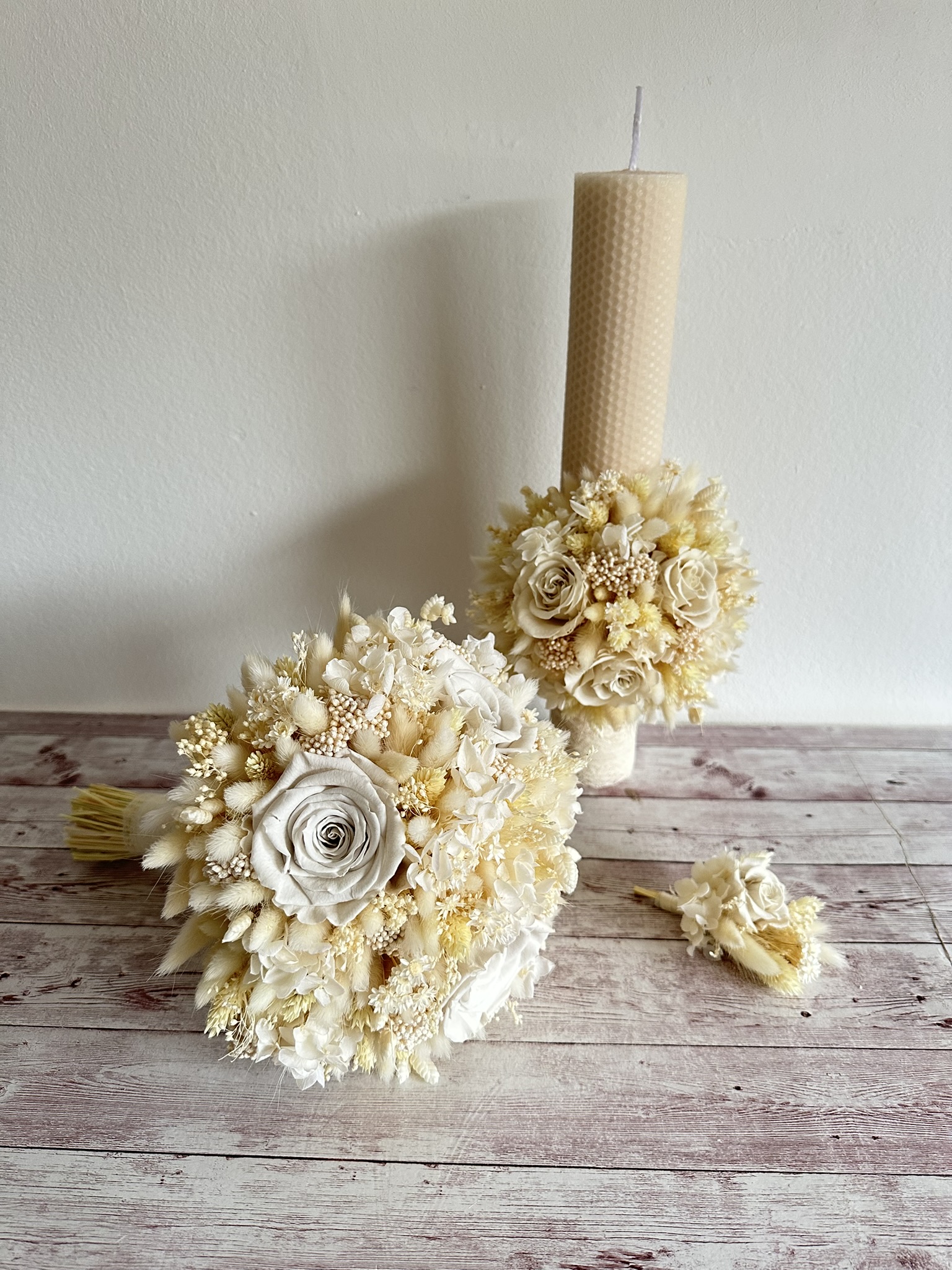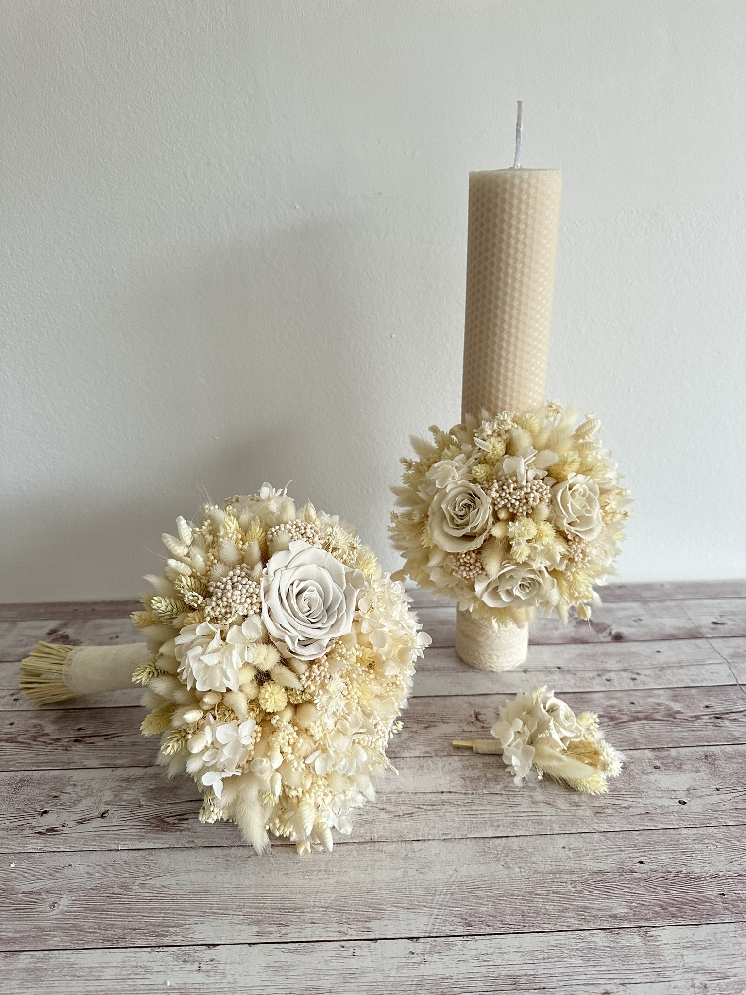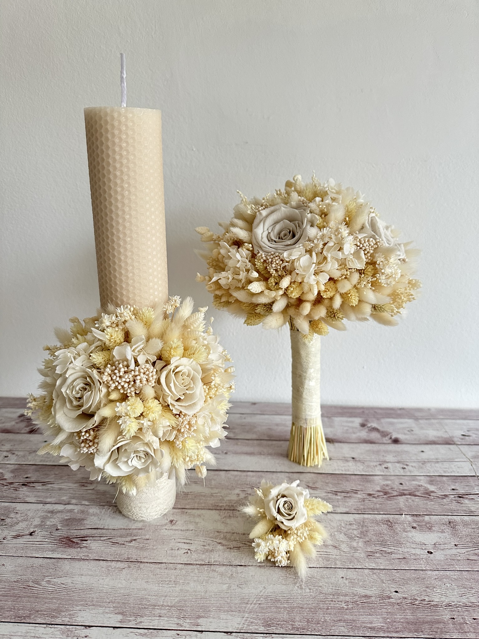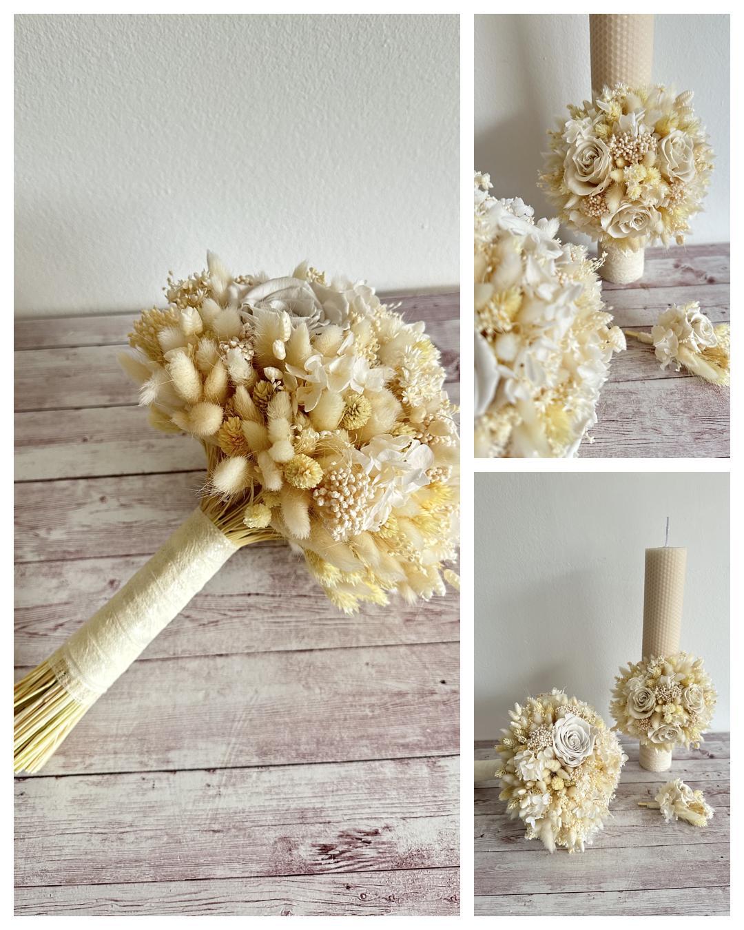 Set nuntă cu flori uscate ivory – buchet mireasă & 2 lumânare si cocarda mire.