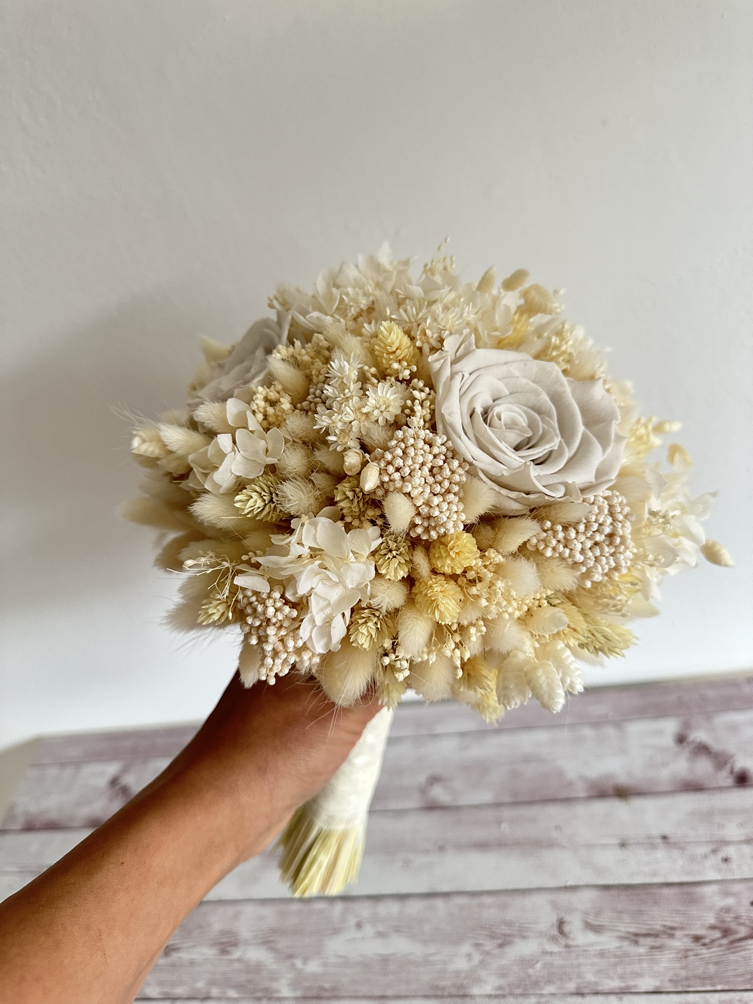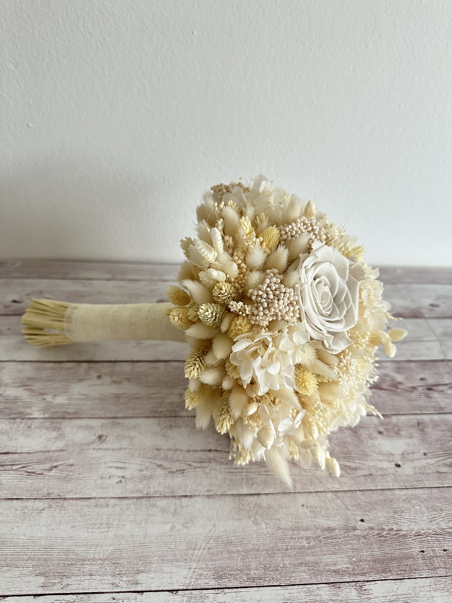 Unul dintre cele mai mari avantaje ale acestui set de nuntă cu flori uscate este durabilitatea sa. Florile nu se ofilesc și nu necesită întreținere, ceea ce îl transformă într-o alegere ideală pentru păstrarea ca obiect decorativ sau amintire de suflet. Fiecare set este 100% handmade, realizat cu grijă și pasiune, iar la cerere poate fi personalizat în funcție de paleta cromatică sau stilul nunții tale.