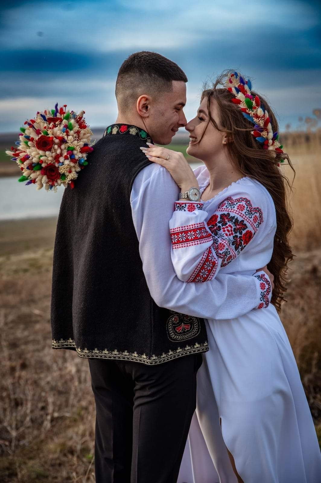 Designul pachetului este inspirat din estetica tradițională și rustică, cu accente folclorice și o paletă cromatică bogată, ce include nuanțe de roșu, crem, verde și tonuri naturale. Buchetul este potrivit pentru mireasă, cununie sau evenimente tematice, iar coronița completează armonios ținuta, fiind ideală pentru ședințe foto, ceremonii în aer liber sau nunți cu tematică tradițională, boho sau rustică.
